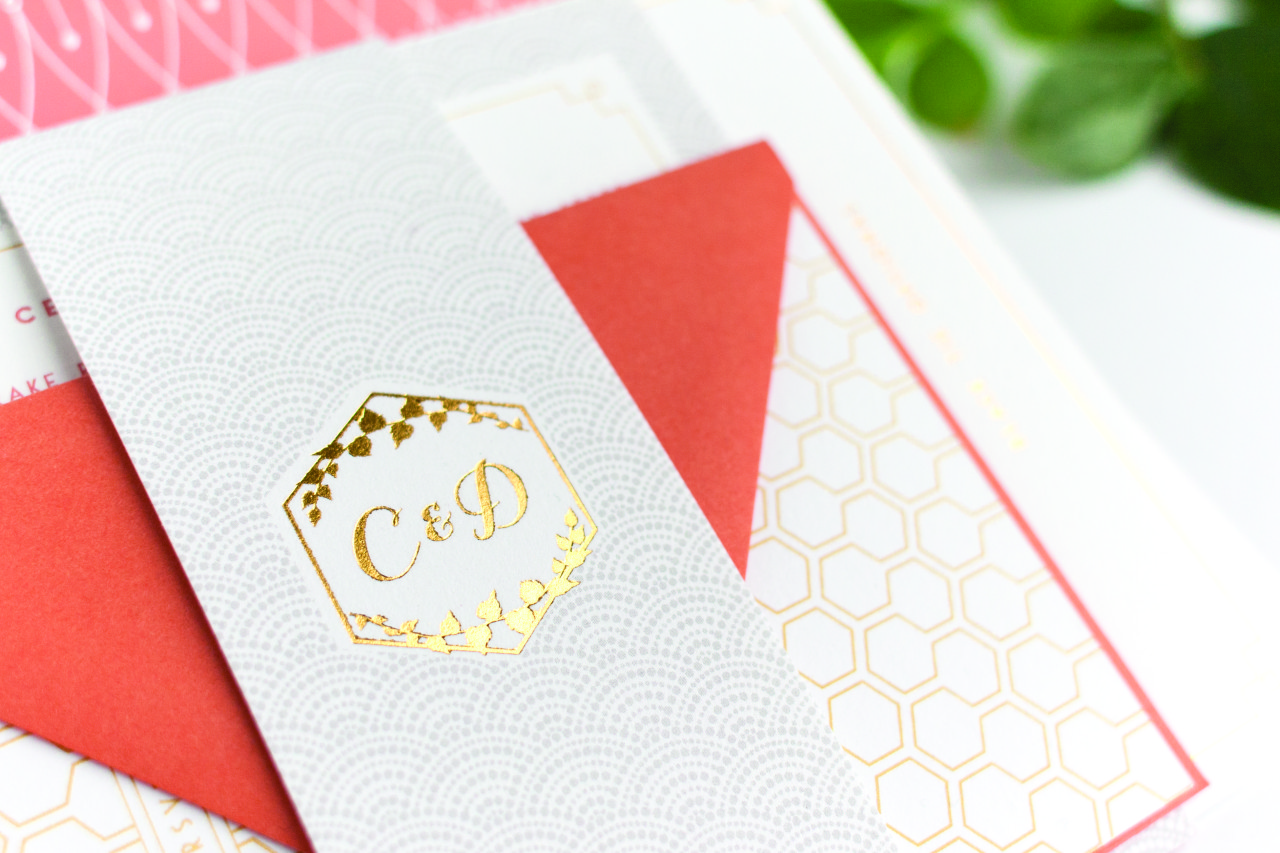 wedding-invitations-coral-pink-gold-metallic-gray-pattern